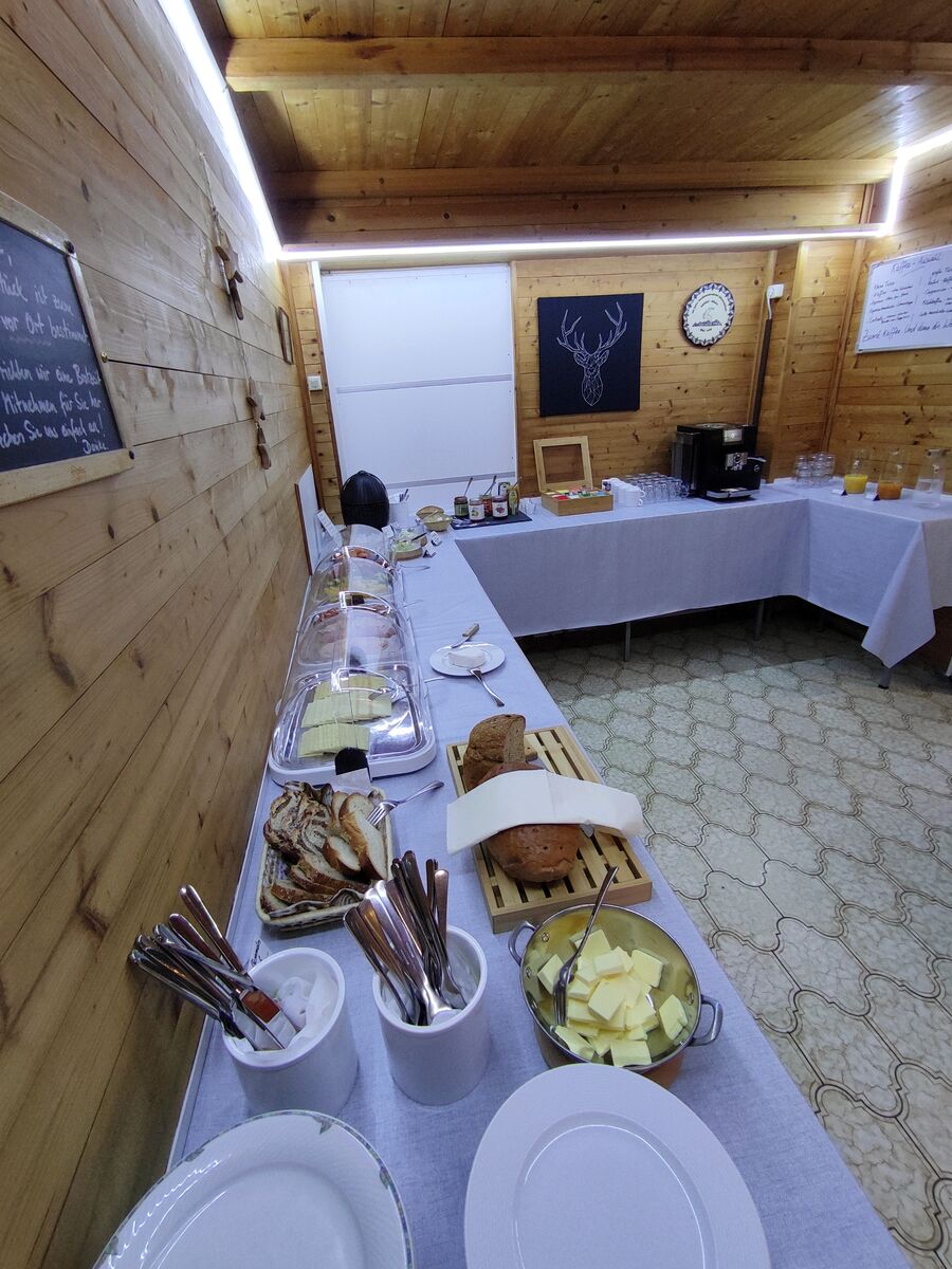 Ein kontinentales Buffet von Wurst/Schinken-Aufschnitt bis Frühstücksei, von der Käse-Auswahl bis zum knackigem Gemüse, von der Marmelade bis zum Palmöl-freien Nougataufstrich, vom Joghurt bis zum hausgemachten Kräuterfrischkäse, vom Hefezopf bis zum Müsli, von der Kornsemmel bis zum Fruchtsaft, vom Brot bis zum Gemüseaufstrich - vieles davon regional und/oder Bio - und dazu verschiedene Tees und leckere Kaffeespezialitäten warten auf Sie.