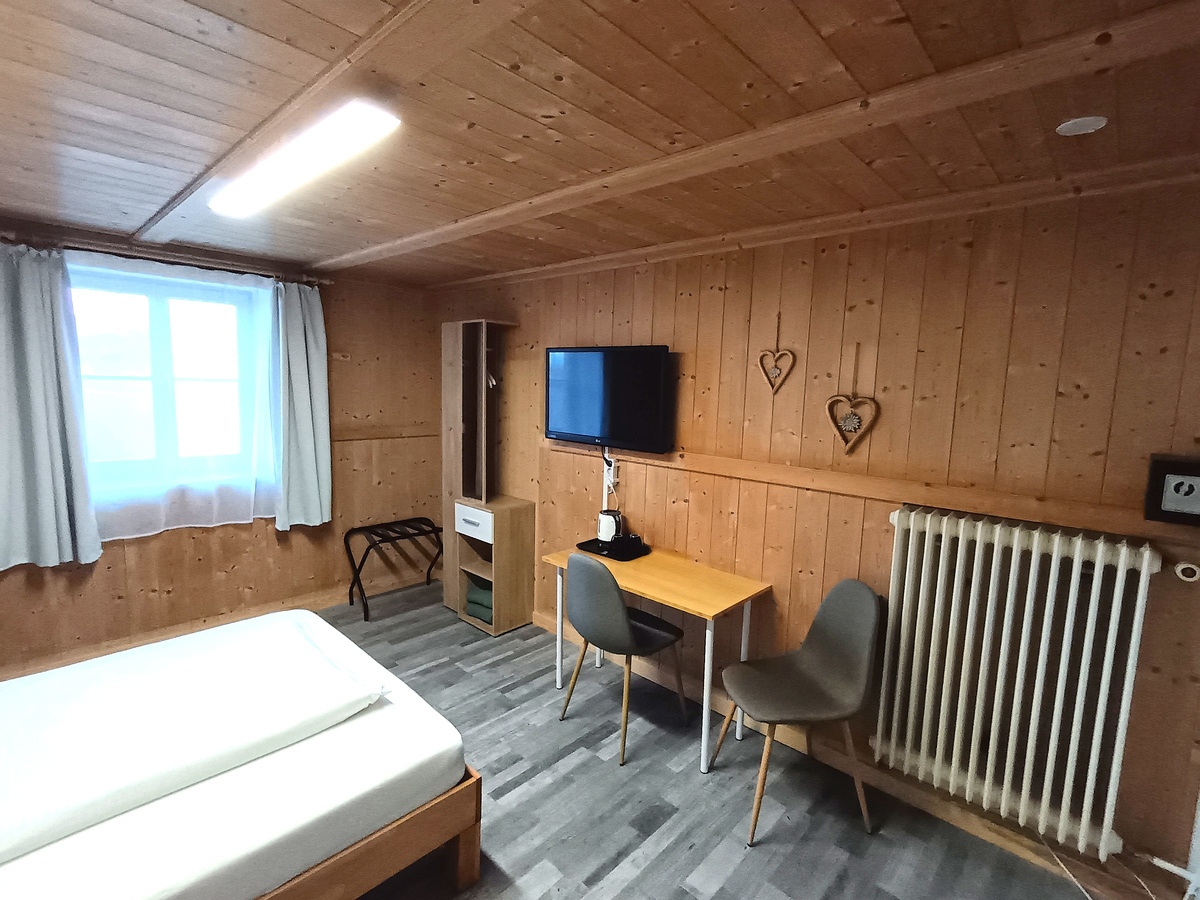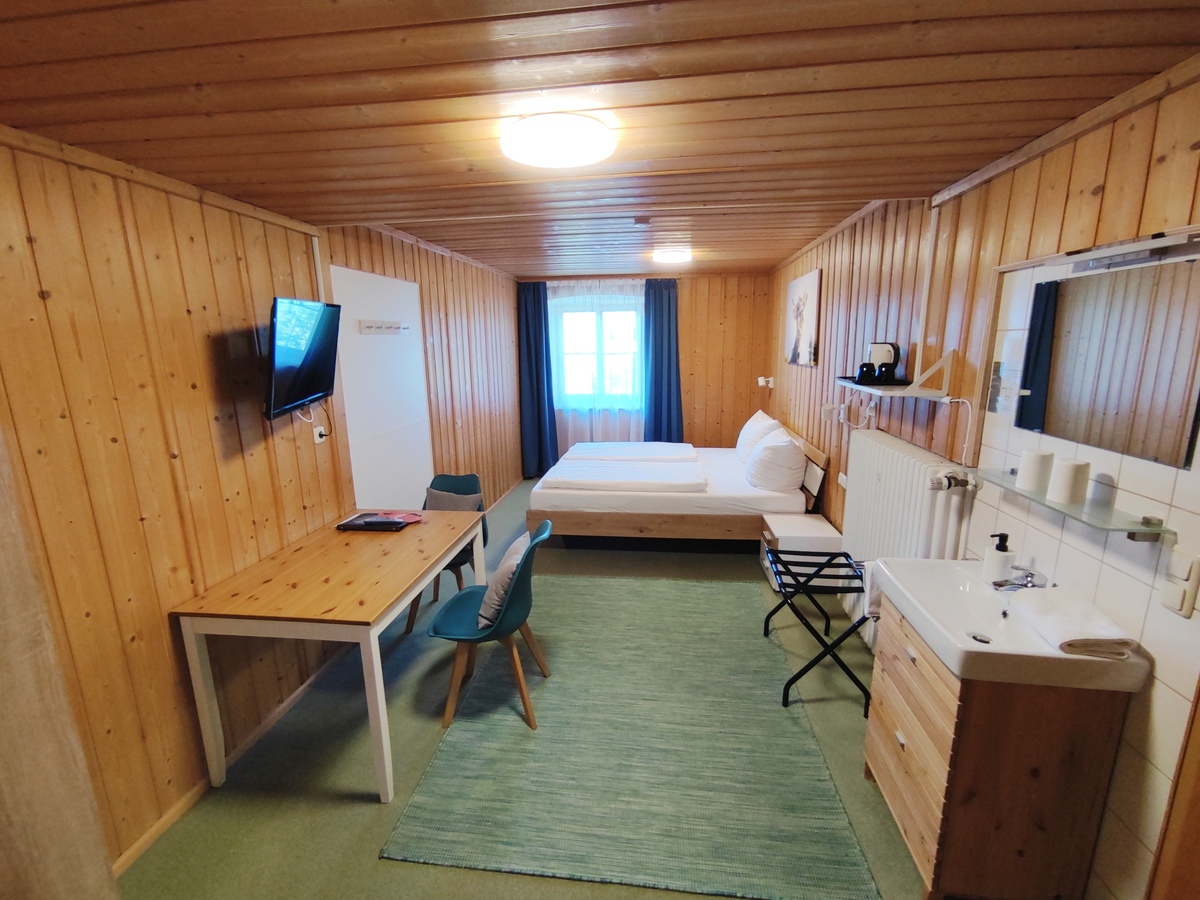 Die individuell möblierten, gemütlichen Doppelzimmer mit Fenster zum Garten/der Wiese und Bergblick, ohne Balkon, haben jeweils ein 180x200-cm-Bett mit offenem Fußende, einen Sitzbereich und einen eigenen Badbereich mit DU/WC.