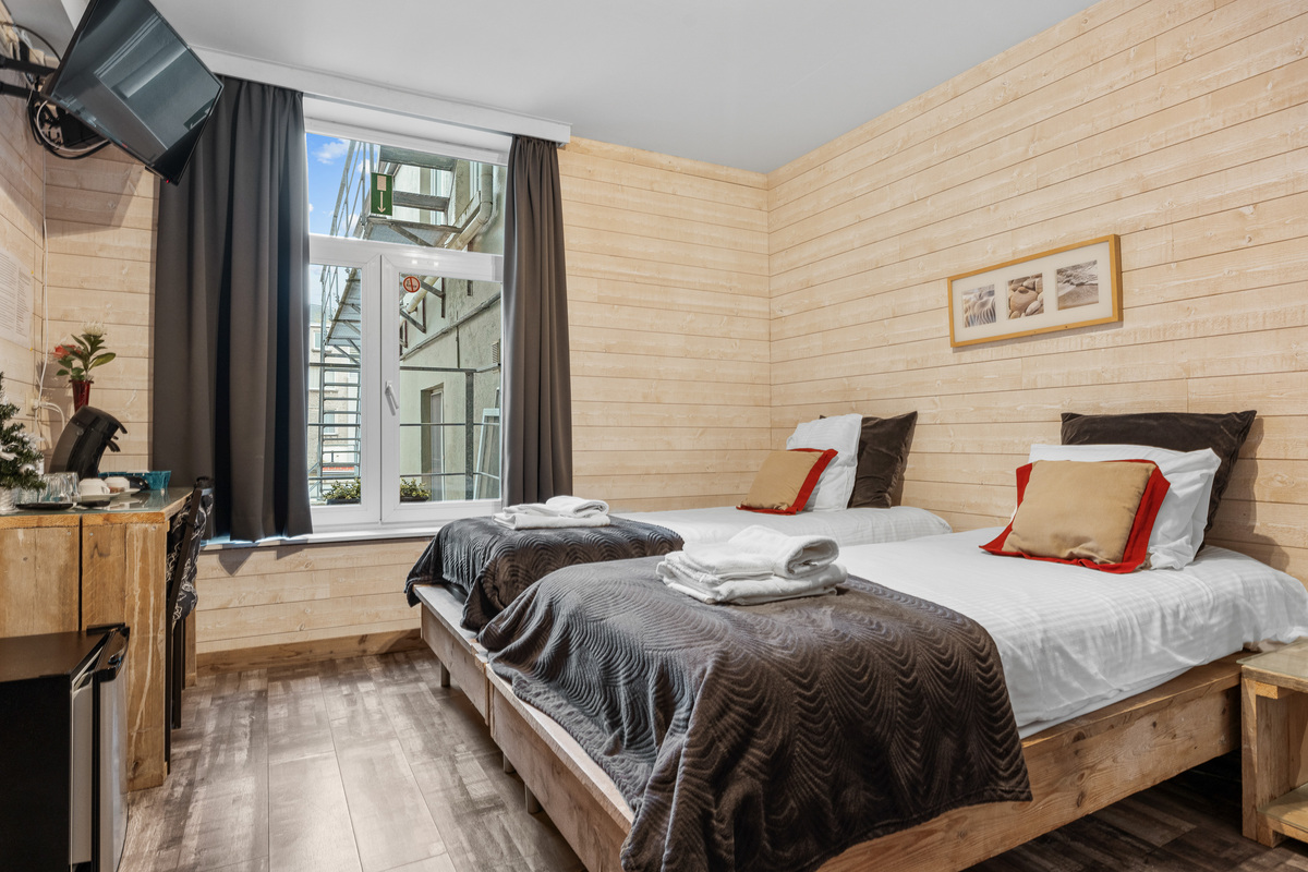 Deze kamer is gelegen aan de achterzijde van het gebouw, zoals op alle kamers is deze voorzien van Televisie, frigo, handdoeken, shampoo en haardroger!