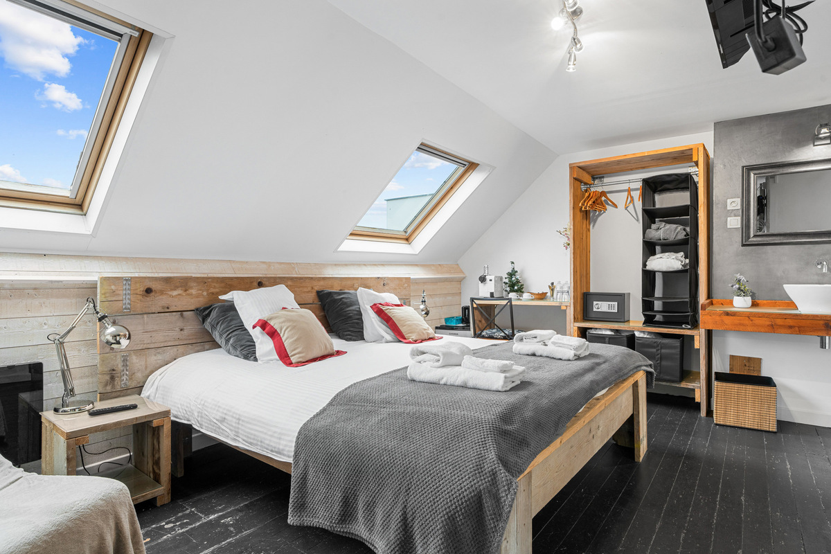 Deze suite is gelegen op de derde verdieping, dit is de ruimste kamer van onze B&B zeer groot bed, XXL kingsize,   en deze kamer kan er een extra bed gemaakt worden van de relaxzetel naast het bed, deze kamer is voorzien van een grotere  Televisie, een douchegang en apart toilet, zeer ruime en klare suite.